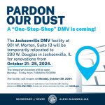 Illinois Secretary of State Alexi Giannoulias’ office announced today that renovations are coming to the Jacksonville DMV location in Lincoln Square. According to the announcement, the Jacksonville DMV facility at 901 West Morton Avenue, Suite 13 will be temporarily relocated to the Jacksonville Municipal Building at 200 West Douglas Avenue from Monday, October 21st to […]